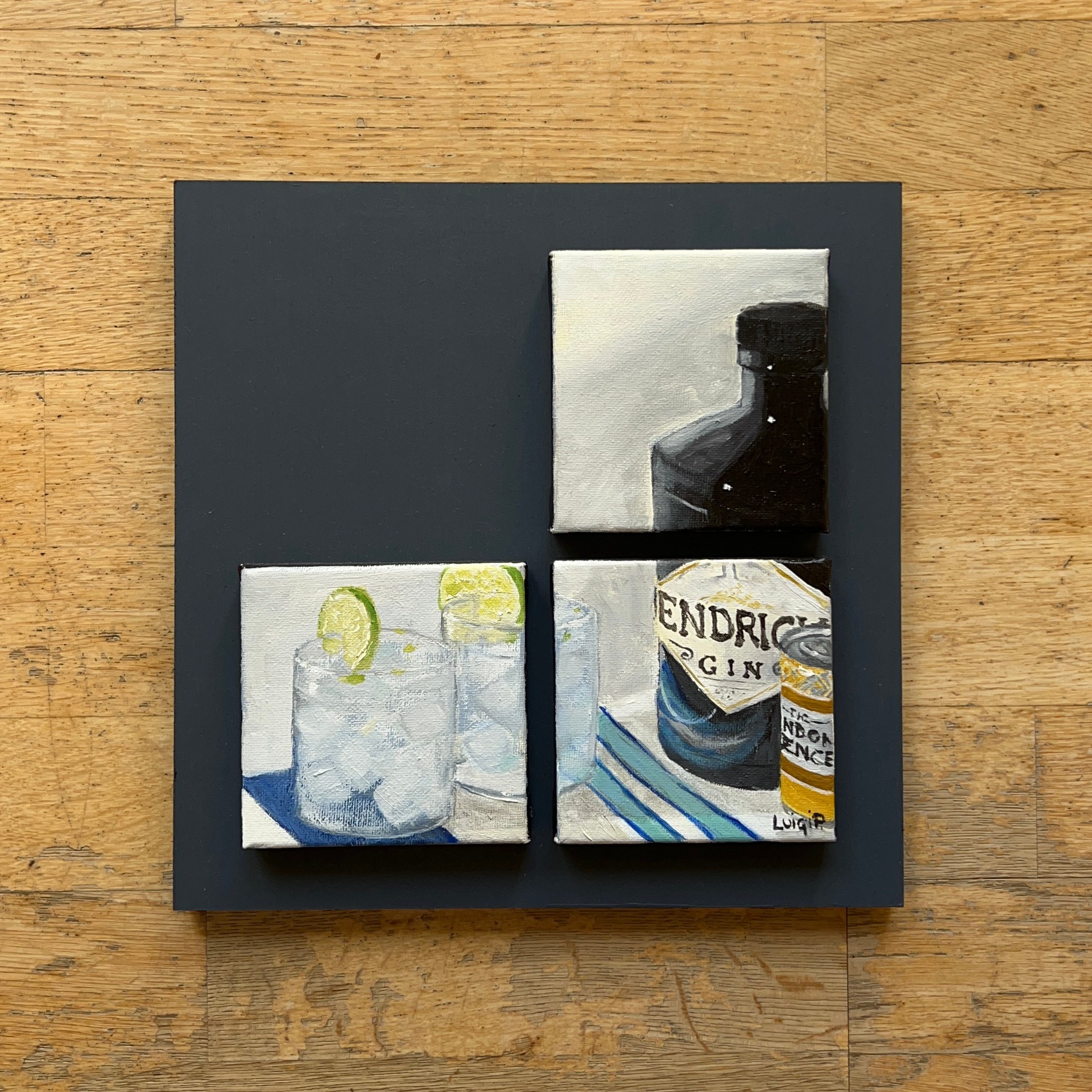 G & T - Oil on three 10x10cm Canvases Mounted on a painted MDF panel (Panel size 26.5cm x 26.5cm)